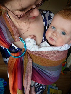 The twenty-sixth visitor looks to be the last of the day, so I flip the kettle on and delegate the afternoon school run. Our final issue is to address the idea of carrying her 5 month old around winter clothing, so we discuss options for comfort and adjustability including demonstrating several kinds of carrying coats and accessories. In the end, the type of carrier was adjusted, swapping something with a lot of fabric – the JPMBB stretchy wrap – for something with much less – the JPMBB ring sling.
